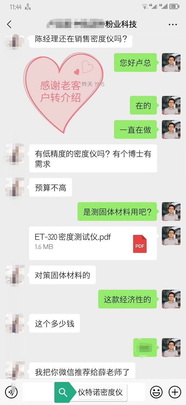 說實話,看到這條消息的時候,心里挺暖的。你想啊,一臺儀器賣出去好幾年了,客戶用著一直沒出問題,所以平時也沒啥機會聯(lián)系。突然有一天,他主動找過來,還給我們介紹新客戶,這種被信任的感覺,真的比什么都珍貴。